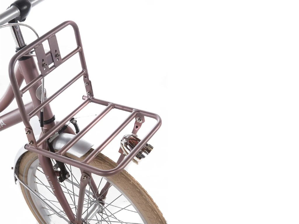 Nieuwe trendy meisjesfiets met voordrager, gesloten kettingkast, batterij LED-verlichting voor en achter en een slot.