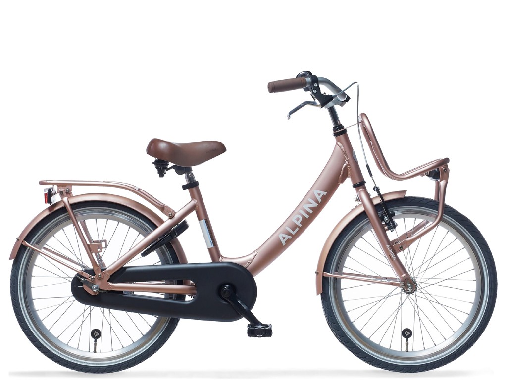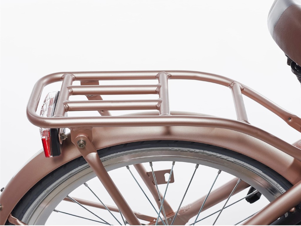 Nieuwe trendy meisjesfiets met voordrager, gesloten kettingkast, batterij LED-verlichting voor en achter en een slot.