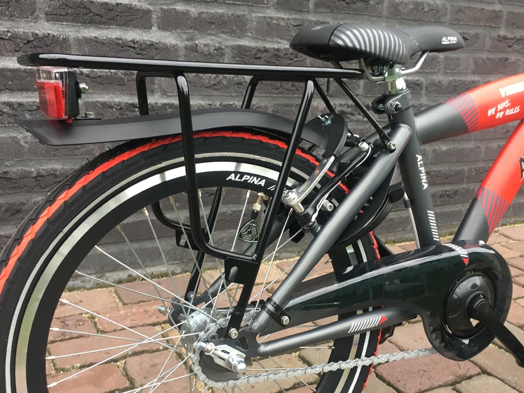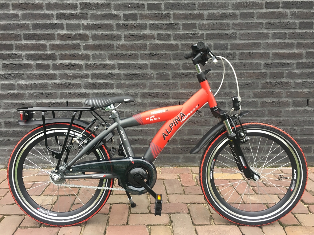 Stoere jongensfiets met verende voorvork, terugtraprem en 2 handremmen, batterij-verlichting V+A en een ringslot.