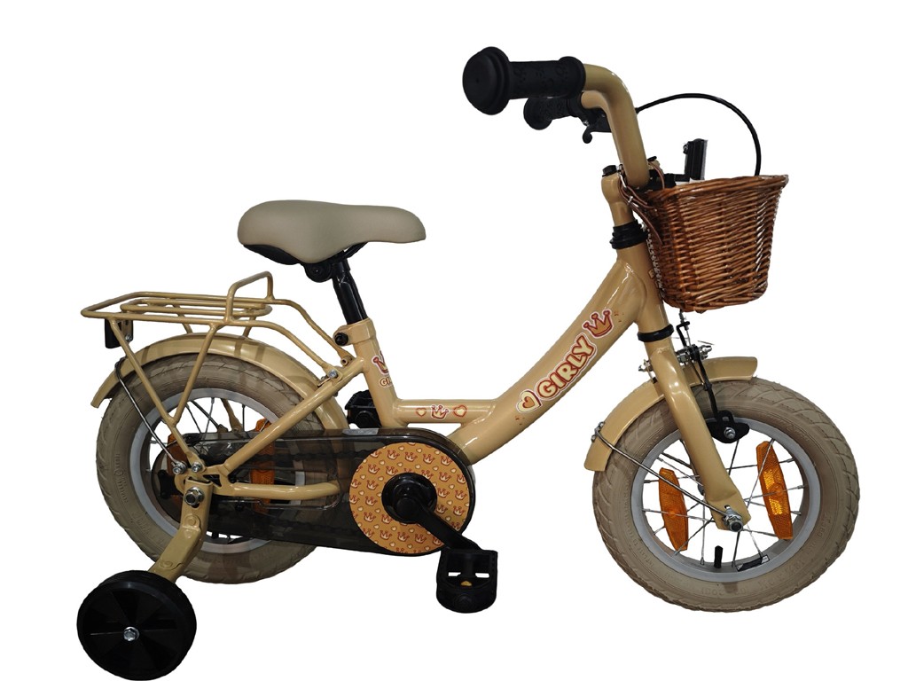 Degelijk 12 inch fietsje met een rotan mandje leverbaar in 3 kleuren.